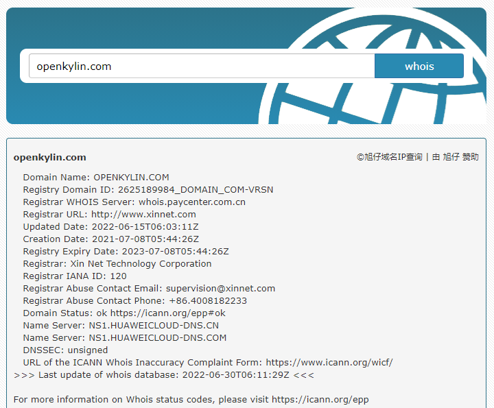 与www.openkylin.top同期注册的有:openkylin.net,openkylin.com.cn日期都是2022年5月5日,都是麒麟软件有限公司所有。